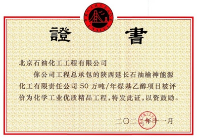 近日,由北京石油化工工程有限公司(簡稱:北油工程)總承包的榆神能化50萬噸/年煤基乙醇項目獲得中國化工施工企業協會頒發的“2022年度化學工業優質精品工程”、“2022年度化學工業安全文明工地”及“2022年度化學工業綠色施工工程”等三項殊榮。