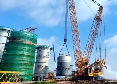目前,DMC裝置主框架鋼結(jié)構(gòu)開始安裝,同時一塔、三塔下段裙座已吊裝就位。兩塔直徑均為8米,高度分別為66.08米和66.7米,重量為455噸和411噸,此次吊裝采用600噸履帶吊,分四段制造及四段吊裝。 為確保順利吊裝,業(yè)主、監(jiān)理、總包、施工單位召開多次吊裝專題會,結(jié)合場地實(shí)際情況,研討制定吊裝方案,嚴(yán)格按照操作要求進(jìn)行施工。在各方人員密切配合下,高質(zhì)量完成了本次吊裝任務(wù)。