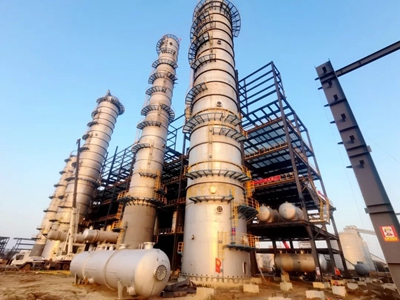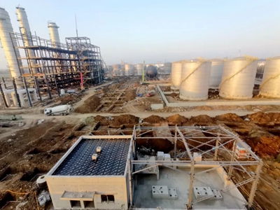 目前,項目整體建設完成64%,裝置鋼結構安裝完成85%,靜設備累計安裝81臺,全廠工藝熱力管網基礎及鋼結構施工完成68%,除鹽水站、灌裝立體庫基礎施工中。
