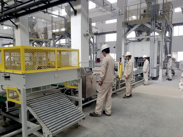 據(jù)悉,該裝置設(shè)置三條包裝線(xiàn),單條包裝生產(chǎn)線(xiàn)每小時(shí)可以完成包裝1600袋40噸聚丙烯顆粒的能力。(通訊員/王秀珍 攝/王秀珍)