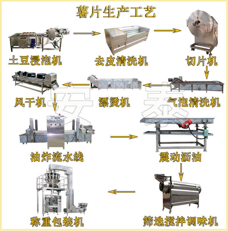 薯片工藝流程:土豆浸泡機 —— 上料提升機—— 清洗去皮機 —— 挑揀線 —— 提升機 —— 切片機 —— 漂洗線 —— 風冷瀝水機 —— 油炸線 —— 振動瀝油機  —— 調味拌料機—— 稱重包裝機